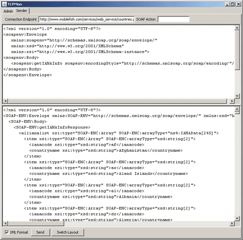 In the first screen, invoke the Countries web service operation "getIANAInfo()" by entering SOAP message: